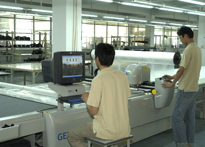 公司采用CAD計算機輔助排料系統(tǒng)進行排料,該系統(tǒng)準(zhǔn)確、高效。鋪料機代替手工鋪料的優(yōu)點使鋪料均勻、整齊、松緊適宜、降低工人勞動強度。